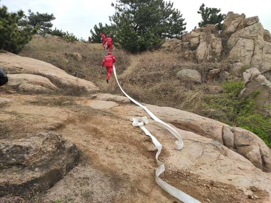 9点30分演练正式开始。笔架山热成像摄像头探测到山顶处温度异常,发现一处火情,热成像系统即刻报警,校园监控室和110值班室同时收到报警信号,值班人员立即启动消防应急预案,各小组各司其职,紧急行动。灭火组驾驶消防车携带灭火装备迅速赶往火灾发生地。由于笔架山地势较高,消防管道覆盖区域有限,消防队员根据地势迅速确定最佳灭火路线, 9点40分消防队员利用消防水带将水源引到火灾发生区域开始进行灭火,火势很快被扑灭,演练圆满结束。