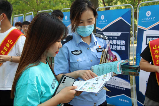 活动现场,安管会学生工作人员引导同学们关注“平安山科”公众号,向参观同学发放反诈知识宣传单页,结合宣传展板向参观同学讲解常用反诈知识,同学们有序观看反诈展板,相互交流讨论日常生活中用到的反诈常识。青岛市经济技术开发区反诈中心胡警官与李警官向同学们剖析常见的校园贷诈骗、网络兼职诈骗、网络游戏诈骗等具有代表性的案件,向同学们宣传反诈知识,介绍犯罪嫌疑人常用作案方式和手法,对同学们现场提出的疑问耐心解答,悉心指导同学们使用“国家反诈APP”和“反诈云盾”,吸引了大批同学驻足倾听。