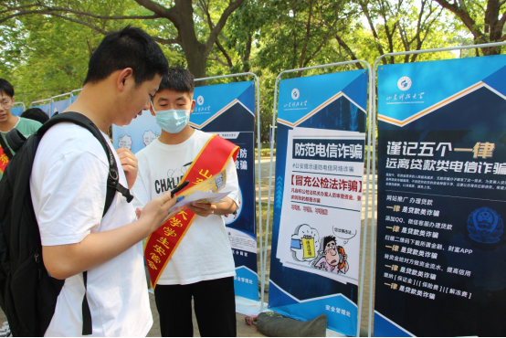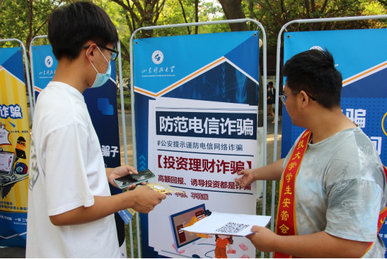 学校安全管理处多措并举,采用线上与线下相结合的宣传方式,引导师生学习防骗知识,提高防骗技能,全力构筑“校园反诈”防线。5月28日下午,安全管理处联合青岛市经济技术开发区公安分局反诈中心在繁星广场开展线下反诈宣传教育活动,活动由学生安管会承办,本次活动是学校“打击治理电信网络诈骗犯罪集中宣传月”安全教育系列活动之一。
