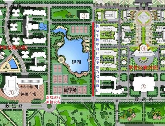 为了保障师生员工生命安全,有效规范机动车驾驶行为,增设钟楼广场东南转盘逆行抓拍设备一套,对不按照交通指示行驶的车辆进行违章抓拍,请全体师生员工自觉遵守校园交通安全管理规定,禁止超速行驶、逆向行驶、违章停车,共同维护良好的校园交通秩序。