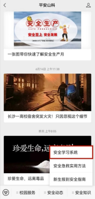 (1)师生员工扫码关注“平安山科”微信公众号,选择“安全知识”模块的“安全学习系统”登录。