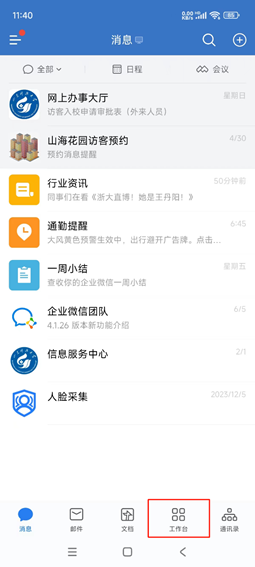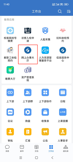 2.手机端请打开企业微信APP,依次点击工作台-网上办事大厅-教职工机动车登记表,进入页面填写相关信息并上传证明材料,报本单位相关领导审批。